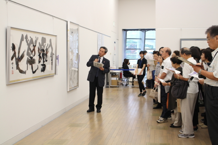 東京展実行委員の先生方によるギャラリートークも始まり、午前中は東京都美術館で岩井秀樹先生(かな)、午後は国立新美術館で中村伸夫先生(漢字)=写真=が、最高幹部の先生方の作品を中心に見どころを解説しました。(左記の写真は読売書法展公式HPより転載いたしました)