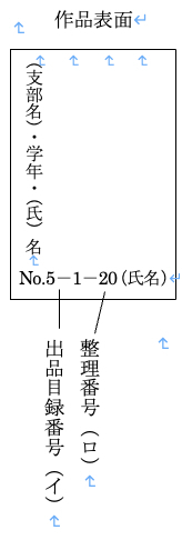⑵ 作品の表面左下に鉛筆で「出品目録番号」と「整理番号」を必ずご記入ください。古典臨書や仮名作品などで作品中に氏名がない場合は、「出品目録番号」「整理番号」とあわせて氏名もご記入ください。